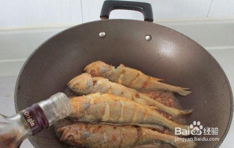 2. 炸鱼:锅中倒入适量的油,油温升至5成热时,将腌制好的小黄鱼放入锅中炸至两面金黄,捞出备用。